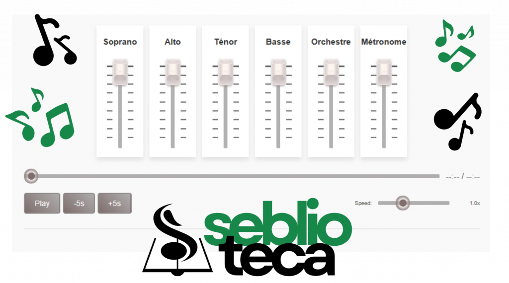 Seblioteca est une plateforme dédiée aux ensembles vocaux. Grâce à notre interface innovante, chaque choriste peut travailler sa partition en toute autonomie : ajuster le volume de chaque voix, activer ou non l’accompagnement piano, ralentir ou accélérer le tempo… comme avec une table de mixage.